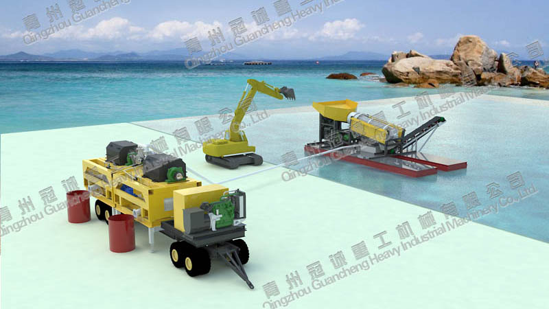 6mm以下物料排入泵箱内由一台4寸沙泵打入岸上离心选矿车内,由两台1200#卧式全自动排矿离心机内进行精选,精选出的精料会自动排入精料箱内,废料自动排入废料区域。